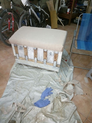 La tapa se le pone fijada con cola de contacto una espuma de 10 cm de grueso y se le pone grapada una tela que se remata para que no se vea la grapa con la pasamanería que se aprecia en esta foto.