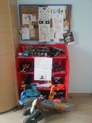 Aquí viene la otra parte, mi hijo se encontró una estantería de cartón con dibujos de la marca Lego construcciones, y se la puso en su habitación. Yo nunca fuí gustosa de esa estantería, pero no me quedaba otra que aguantarme pues el ponía allí todas sus construcciones y sus cosas. Un desastre vamos .....jajajajj