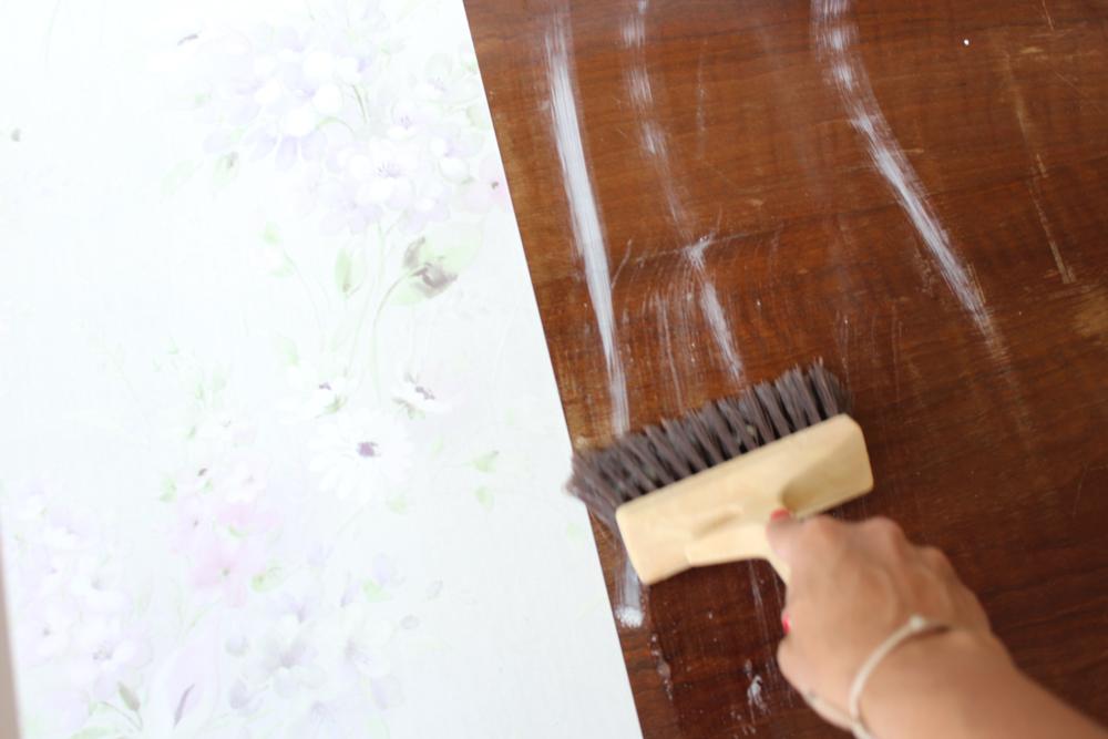 Decidimos forrar el fondo de la vitrina con este papel de flores que compramos en leroy merlin, y para los interiores y otra de las piezas elegimos este verde tan bonito. Para forrar el fondo utilicé una cola especial para papel de pared. Este paso requiere paciencia y cariño, cuanto más gordito sea el papel más fácil es la colocación. Tenerlo en cuenta.5 – MONTAR PIEZAS