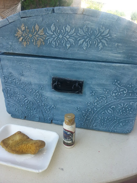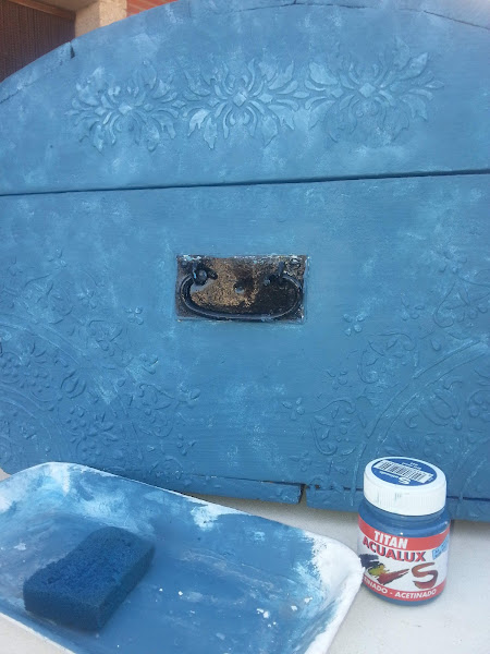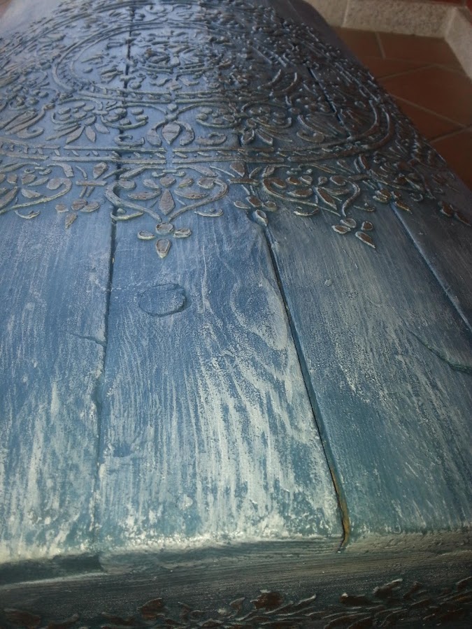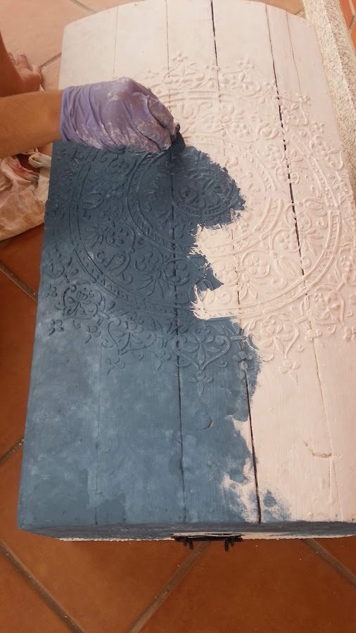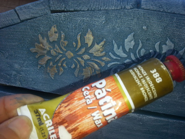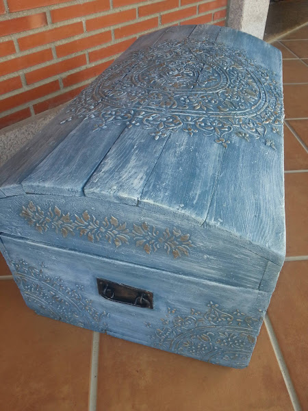 Para los stencil en relieve doy esta patina de cera con el dedo, y crea unos reflejos increíbles, de verdad que las fotos no hacen justicia de lo bonito que quedó el baúl.