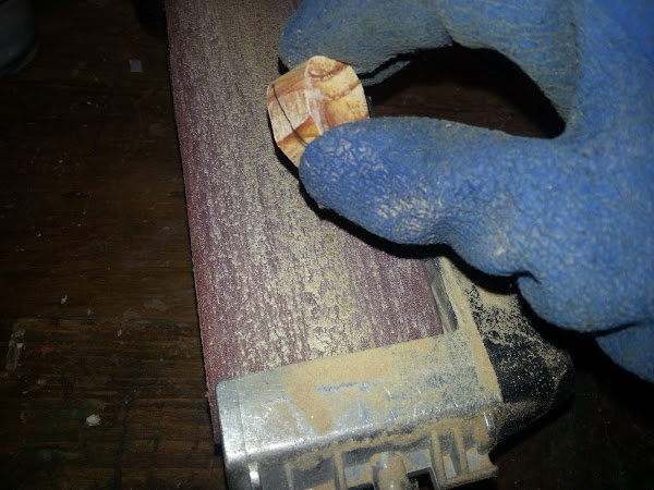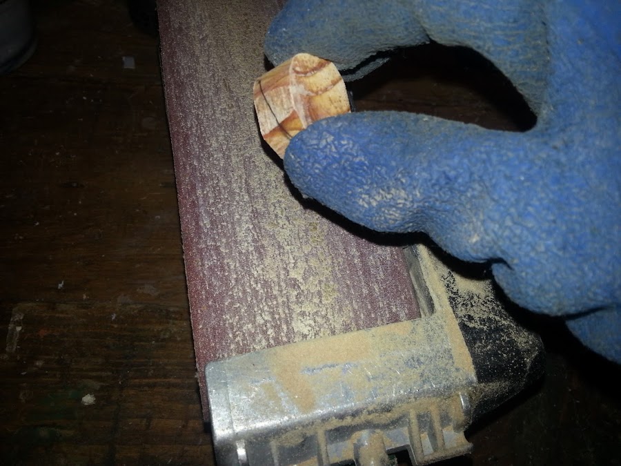 Corto un trozo de madera y con la lijadora a velocidad lenta y por supuesto con unos guantes le voy desgastando hasta que consigo el tamaño justo del agujero que pretendo tapar.
