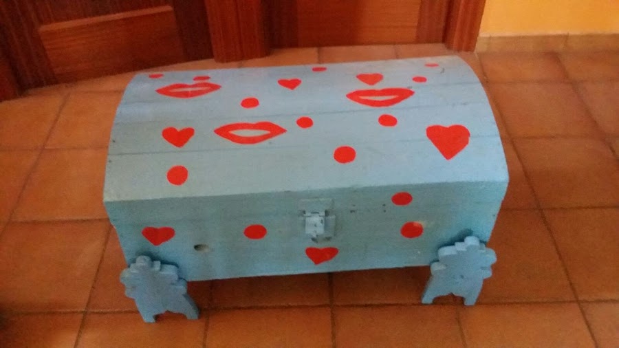 Esta baúl, se le encontraron en la basura tirado, y tanto por su forma como por su tamaño le encantó a mi sobrina. La madera de pino con que estaba construido estaba sana y la estructura se encontraba en buen estado. Lo único que la decoración, era un poco peculiar.......claro que para gustos los colores.