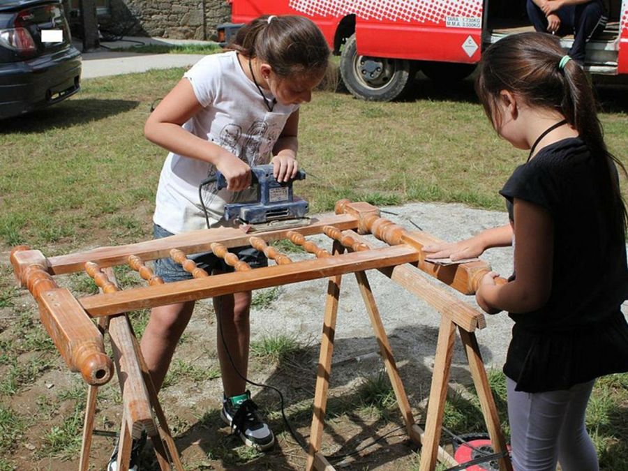 Las sobrinas de nuestra amiga colaboraron animosamente en la tarea. Aquí las vemos en la primera fase del tuneo, el lijado.