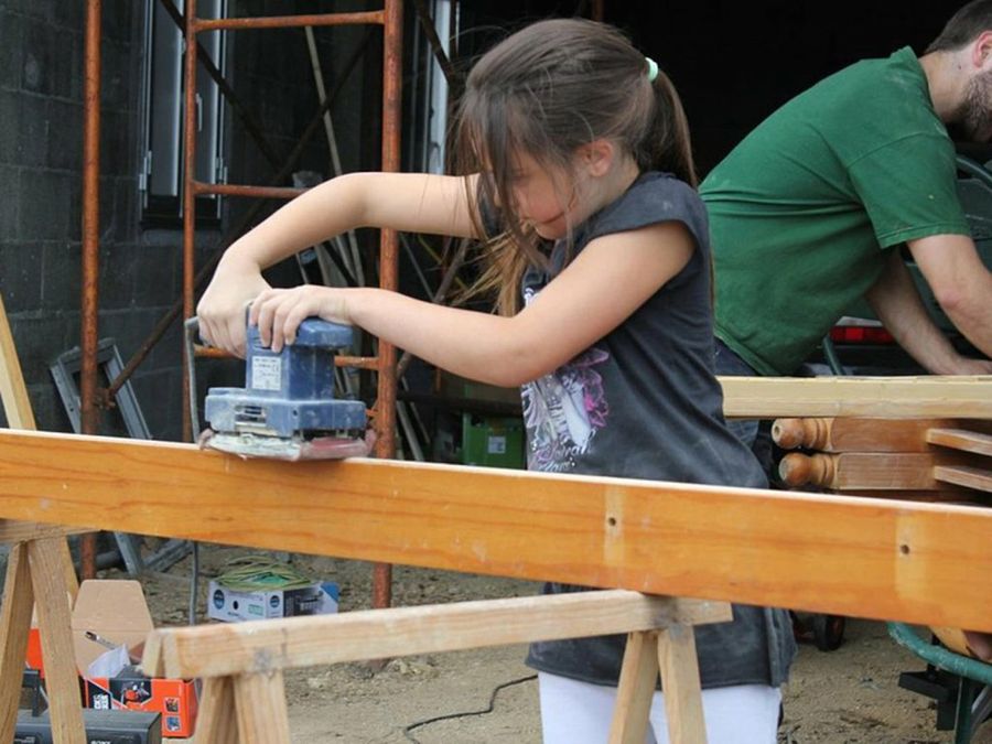 La lijadora desprende mucho polvo, y por ello como vemos la familia decidió realizar las tareas en el jardín.