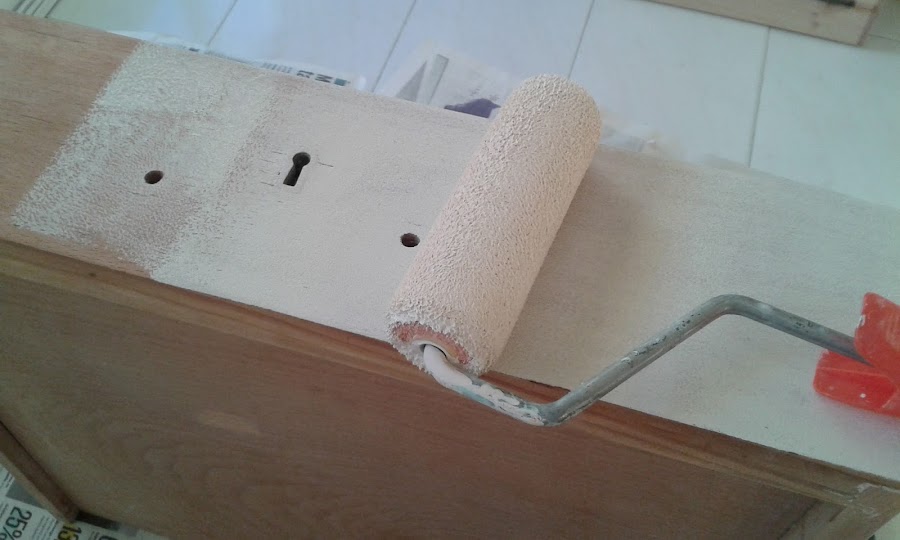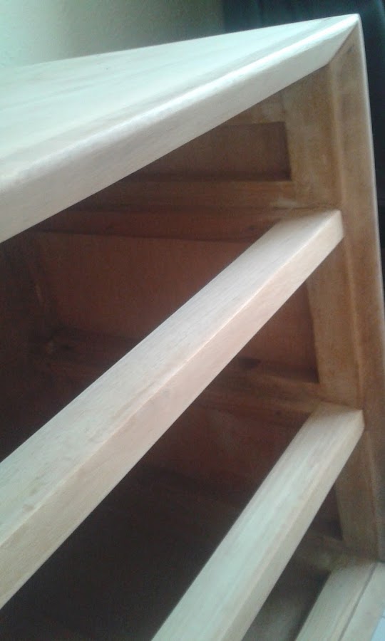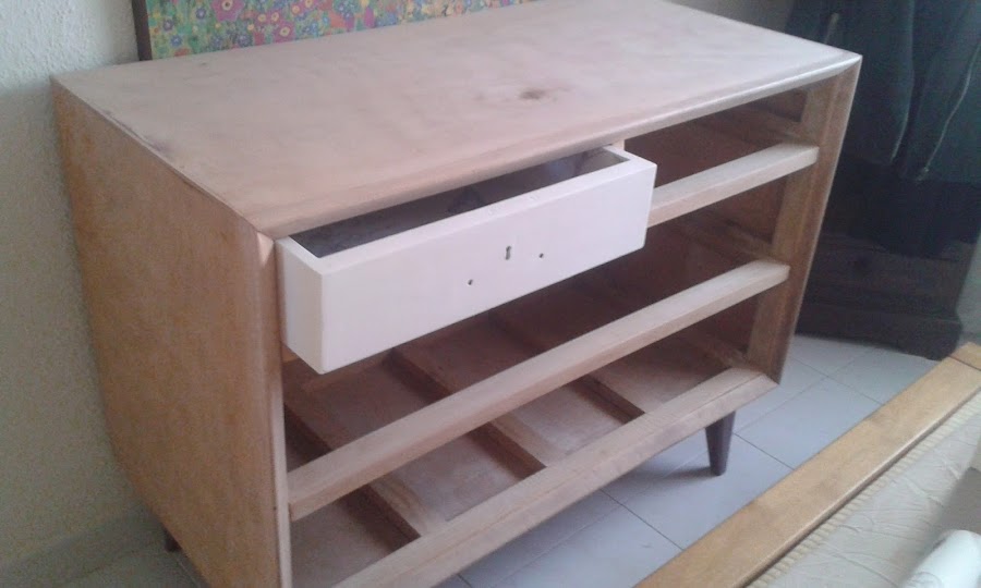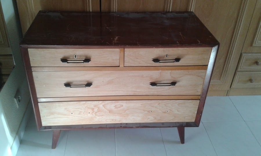 Comenzamos limpiándola con agua y un poco de lejía. Encolamos las partes desencoladas y lijamos toda su superficie por la parte exterior pues estaba muy arañada. Dejándola con tacto suave para posteriormente proceder a darle la pintura elegida. Solo le damos al frente de los cajones, resto color natural.