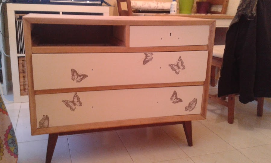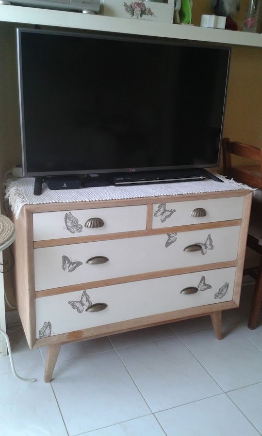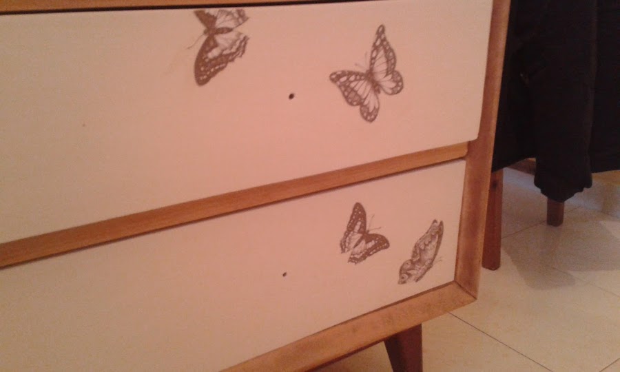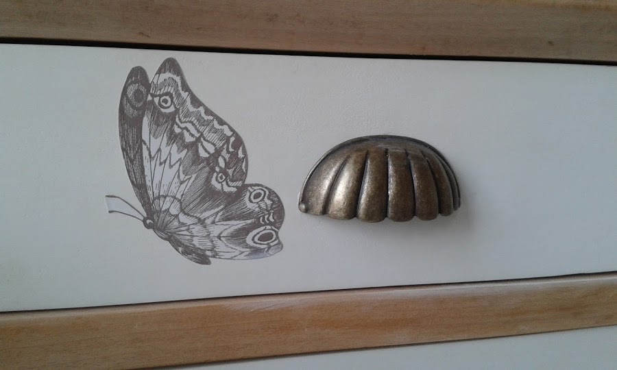 Después cambiamos los tiradores con aire rustico también en forma de concha y una vez colocados le damos el toque de gracia final para realzar la belleza de esta pieza colocando unas mariposas revoloteando por los cajones.