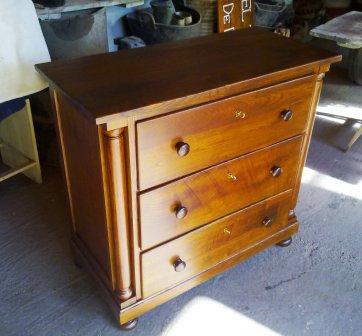 Volvemos con otra cómoda. Esta vez nos encontramos ante una pieza con muchas capas de barniz, lo que nos augura un largo trabajo de lijado. Los tiradores se encuentran en muy mal estado y el contrachapado de la tapa y los cajones está muy deteriorado. Tras lijar la pieza observamos que bajo todas esas capas de barniz, hay un bonito detalle en marquetería en los cajones. El resultado final es una c ...