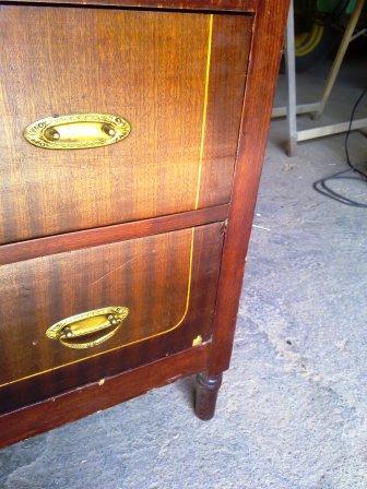 Volvemos con otra cómoda. Esta vez nos encontramos ante una pieza con muchas capas de barniz, lo que nos augura un largo trabajo de lijado. Los tiradores se encuentran en muy mal estado y el contrachapado de la tapa y los cajones está muy deteriorado. Tras lijar la pieza observamos que bajo todas esas capas de barniz, hay un bonito detalle en marquetería en los cajones. El resultado final es una c ...