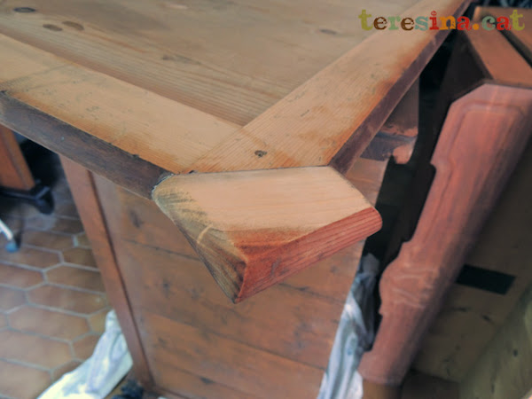 Després va venir la fase de reconstrucció. Primer la peça de la cantonada de la fusta superior, i després la del lateral. Haig de reconèixer que aquesta feina va ser la més laboriosa, treure un patró de les peces, tallar, polir, provar, polir, provar, ... i així fins aconseguir que encaixessin completament. I finalment tenyir-les del mateix color per que no es veies la diferencia.