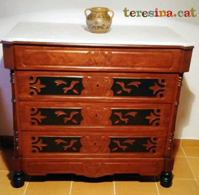 Com veieu la calaixera estava en un estat lamentable. Coberta d"una capa rància de brutícia, la part del darrera i les potes corcades, les fustes de l"interior dels calaixos amb esquerdes enormes. També li faltaven trossos de la fusta superior, sobre la que es recolza el marbre, i que vaig haver de reconstruir.