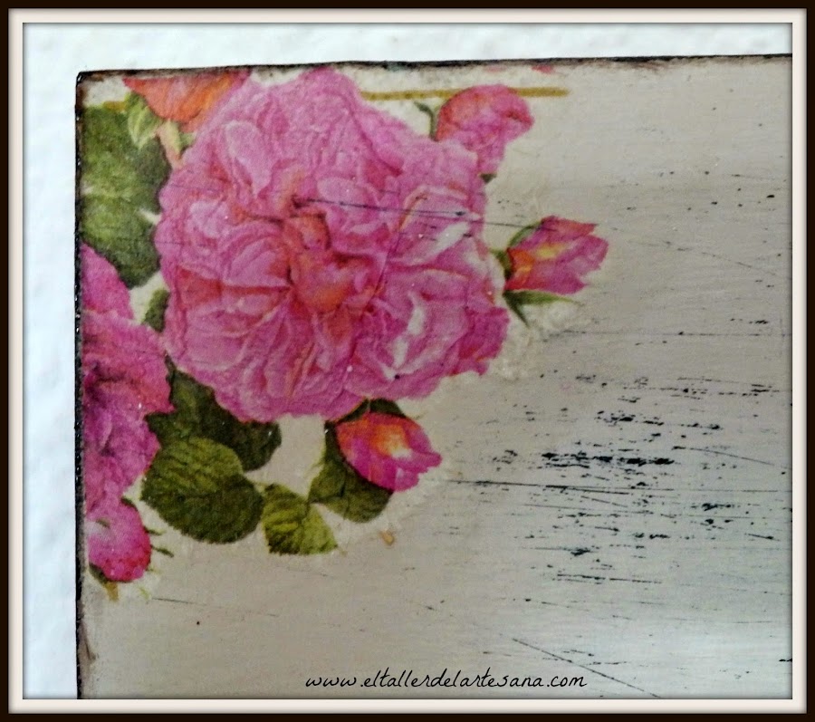 Las flores de las esquinas es decoupage con servilletas de Lucía de Momentos Vintage. Son dos servilletas distintas que combinan muy bien. Las pego con una mezcla de cola rebajada con un poquito de agua. Cuando está seco pongo la misma cola encima para proteger.