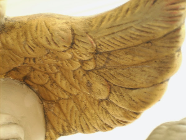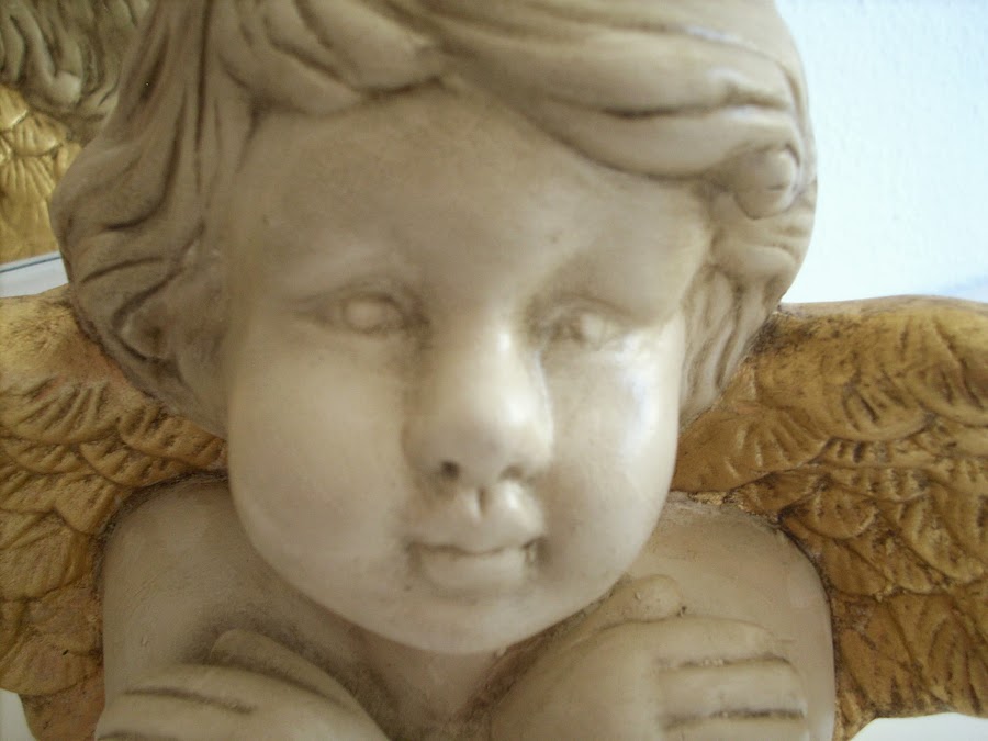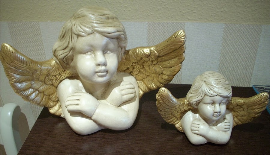 Estos son unos angelitos de escayola que eran bastante feos y que he transformado para que luzcan en todo su esplendor. Están pintados en una base acrílica blanco roto y con una pátina tostada. Las alas lucen preciosas con pan de oro. Hay dos tamaños.
