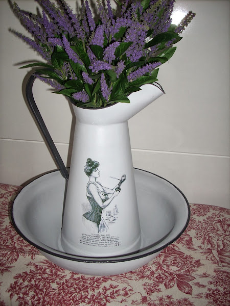 Por último os quiero enseñar, aunque ya no lo tenga, ya que fue a parar a una casa rural, un palanganero que restauré. Lo compré en un mercadillo de antigüedades de Portugal y la verdad es que estaba en un estado bastante deplorable. Lo que le hice fue darle varias capas de imprimación y luego varias capas también de un color gris muy clarito y en los bordes un gris muy oscuro casi negro. Después transferí una preciosa imagen de una señora vintage con corpiño. Creo que le va fenomenal a la pieza. Y ya está luciendo precioso en su nueva casa.