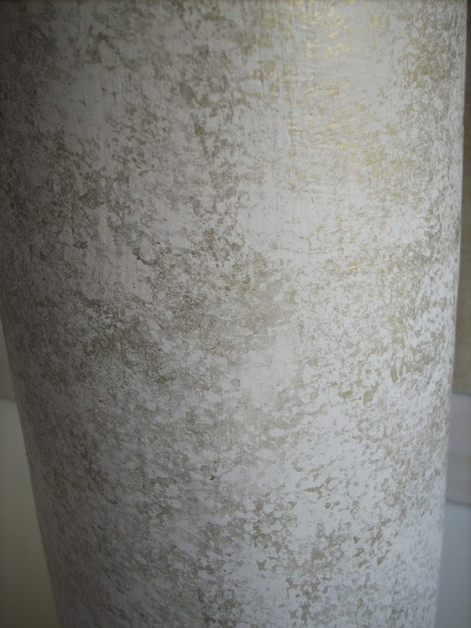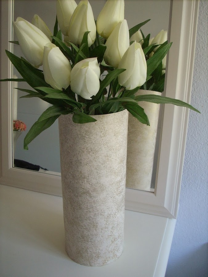 Lo siguiente que os quiero mostrar es un florero. En un principio era de acero inoxidable mate, bastante soso. No tengo fotos del antes pero supongo que os hacéis una idea. Como es de lineas muy depuradas no quería recargarlo mucho, sobre todo porque no quedaría bien y además en decoración menos es más... Simplemente tras darle varias capas de imprimación le di varias manos de acrílica beige y después un embolsado con una purpurina líquida dorada. El resultado es muy sútil y cuando le da la luz queda precioso.