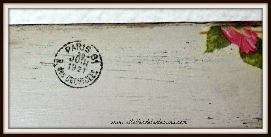 Las flores de las esquinas es decoupage con servilletas de Lucía de Momentos Vintage. Son dos servilletas distintas que combinan muy bien. Las pego con una mezcla de cola rebajada con un poquito de agua. Cuando está seco pongo la misma cola encima para proteger.