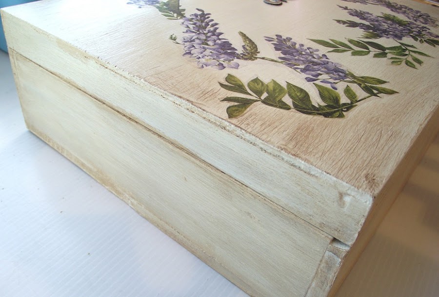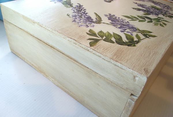 Utilicé un papel de arroz con glicinias que ya había usado en este perchero y que me encanta lo bonito que queda sobre fondo color crema.