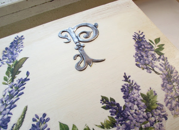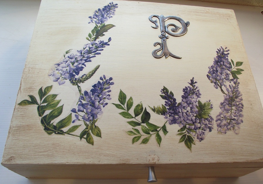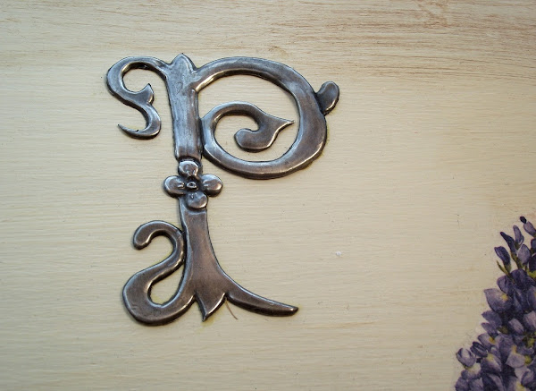 Antes de pegar la P le di a toda la caja una mano muy suave (aplicar y quitar casi inmediatamente) con pátina marrón oscuro y para finalizar barniz satinado en spray, así la limpieza es más fácil y no se deteriora la decoración.