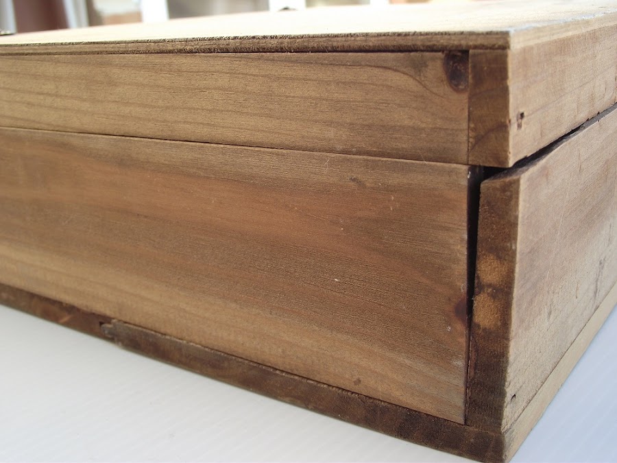 La tapa tenía manchas, porque la caja llevaba unos meses en una leñera (de milagro se salvó jaja), pero en realidad eso no tenía mucha importancia porque la madera no era bonita y desde el principio pensé en pintarla en color claro.