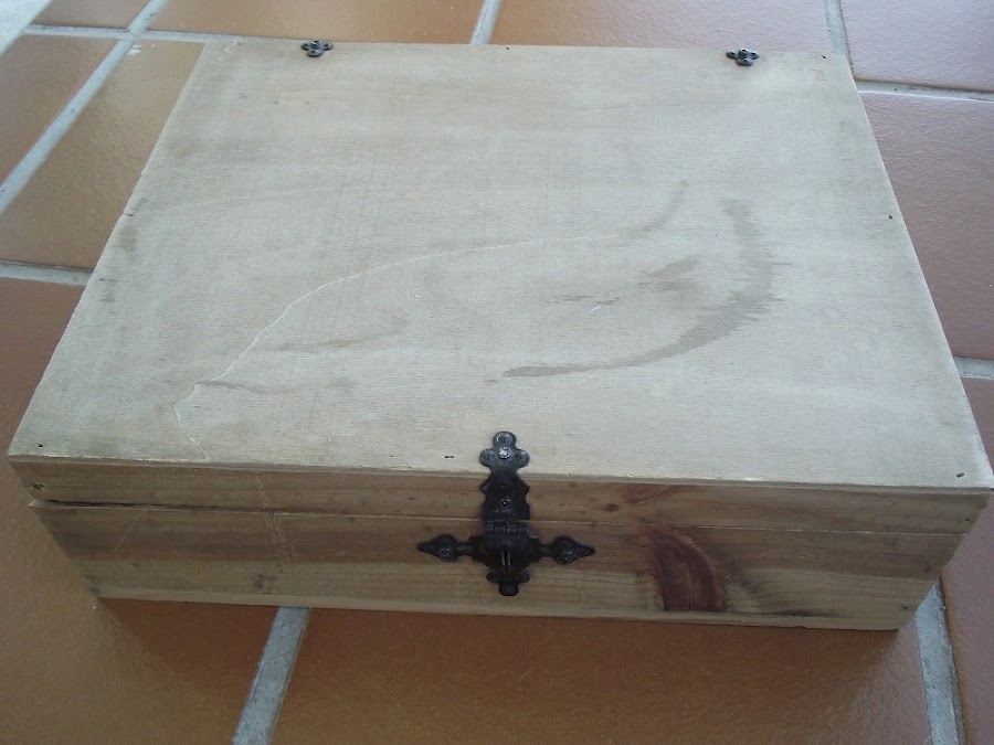 Las bisagras y el tirador negro de hierro me parecían demasiado grandes y aparatosos para una caja de este tamaño, así es que los sustituí por unas bisagras doradas pequeñitas y un tirador también pequeño. Los de hierro los guardaré para otro trabajo (¡¡aquí no se tira nada xD!!).