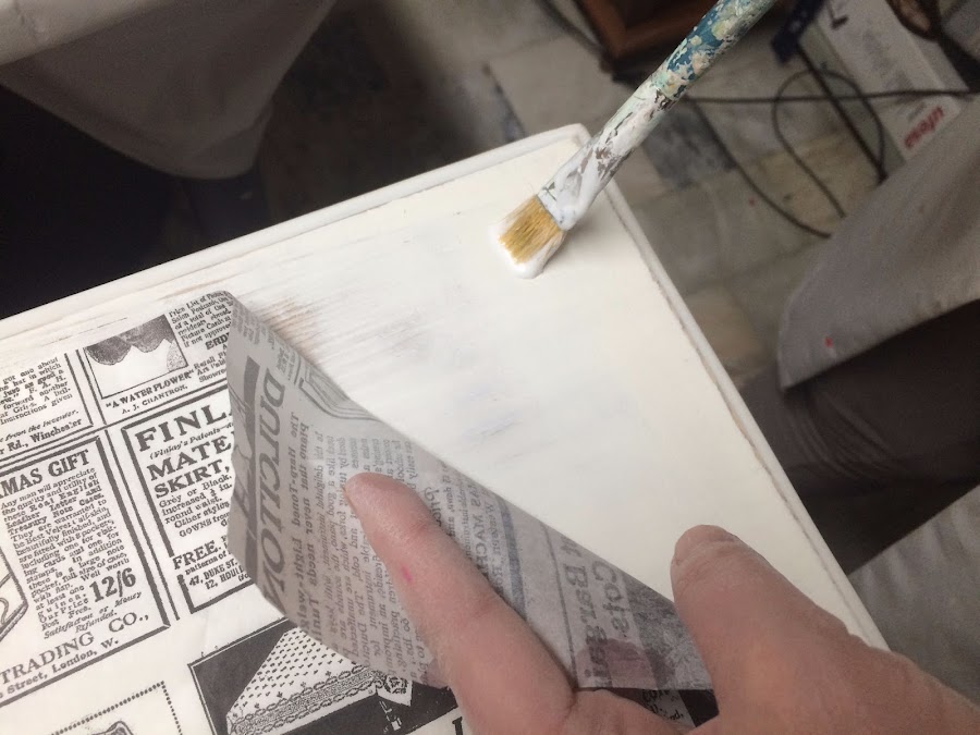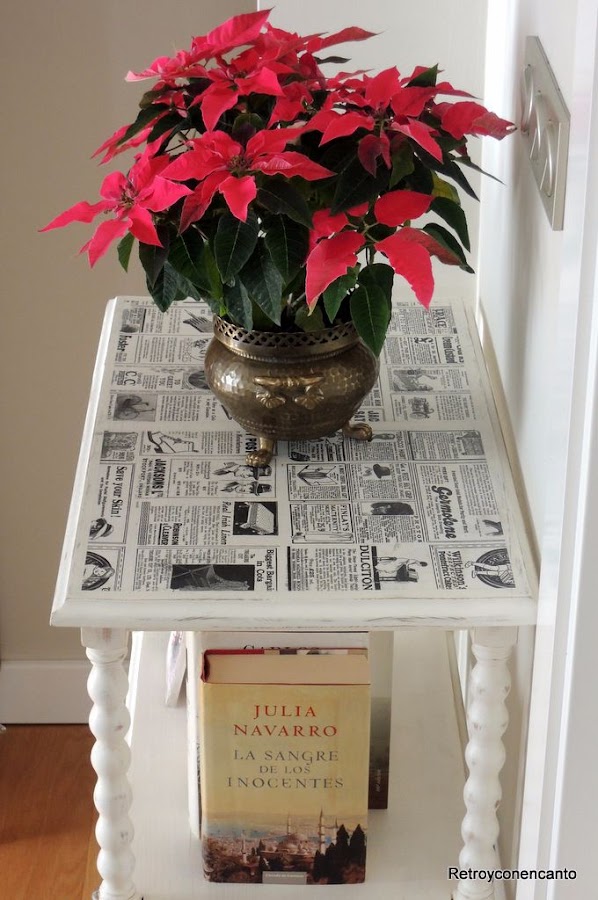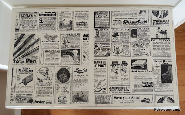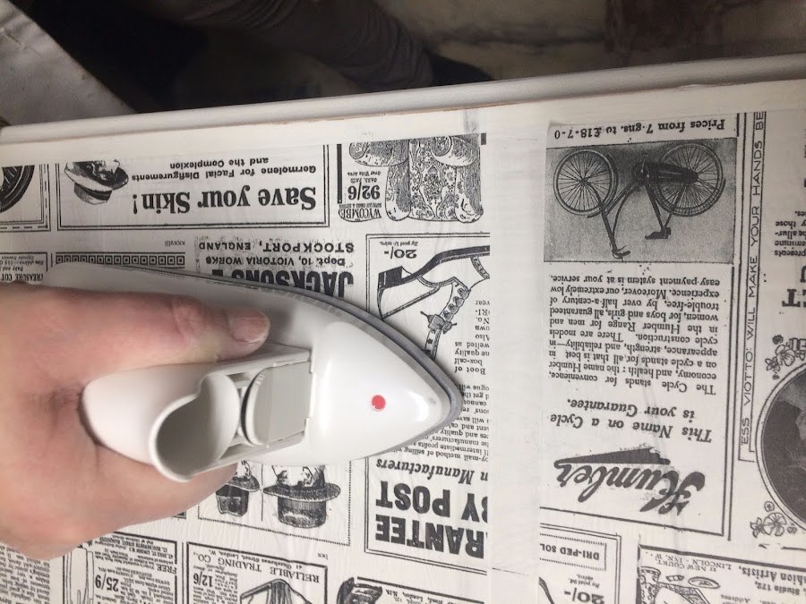 Aplicamos esas maravillas en el sobre principal de nuestra mesa con la técnica del decoupage, y usamos la plancha para adherir mejor (¡qué invento!).