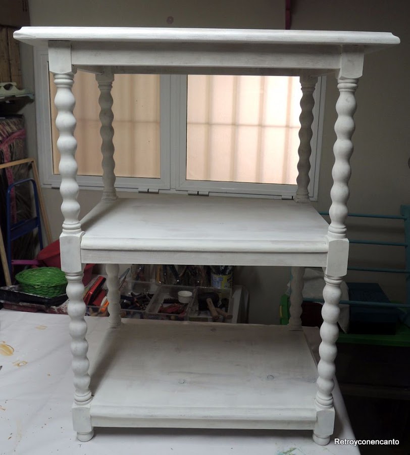 No perdimos ni un minuto en meterle mano, y tras un suave lijado (estaba en madera vista y no necesitaba mucho más), y una capa de líquido antipolillas para evitar futuros "habitantes", aplicamos pintura a la tiza blanco roto.