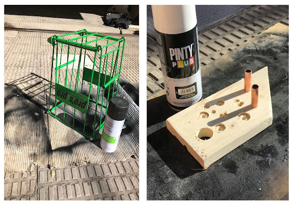 El reto especifica que tiene que ser con materiales reciclados. Buscando por casa encontré un cesto de pelotas de tenis descolorido y con una rueda rota y la base de una bandeja de desayuno que hice hace tiempo y que desmonté para darle un nuevo aspecto. Ahora hará de base de esta mesa auxiliar. Además reutilizaré unos pequeños listones que harán de topes para poder encajar la tapa en el soporte de la cesta y fabricaré unos pequeños pomos con varillas de cobre.