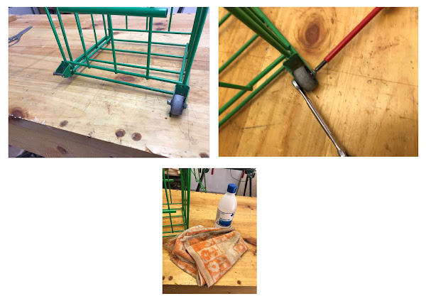 Lo primero que hice fue desmontar la rueda que quedaba, sacarle las patas y pasar un trapo con alcohol medicinal de 96 grados para limpiarlo antes de darle spray negro.