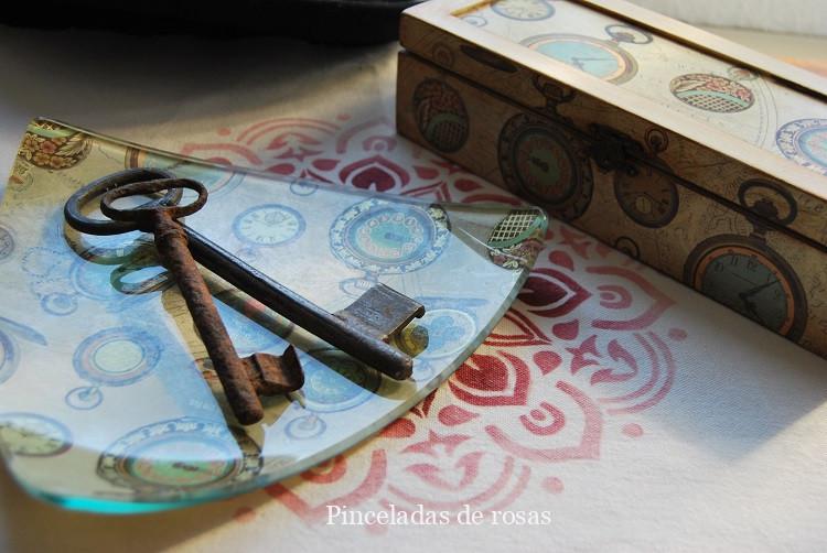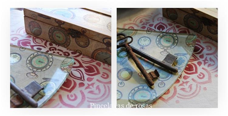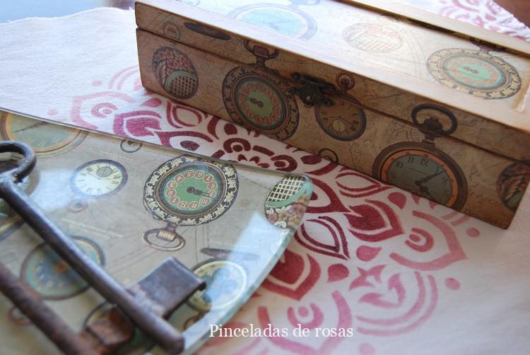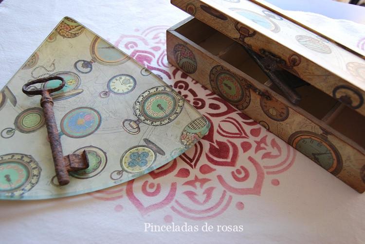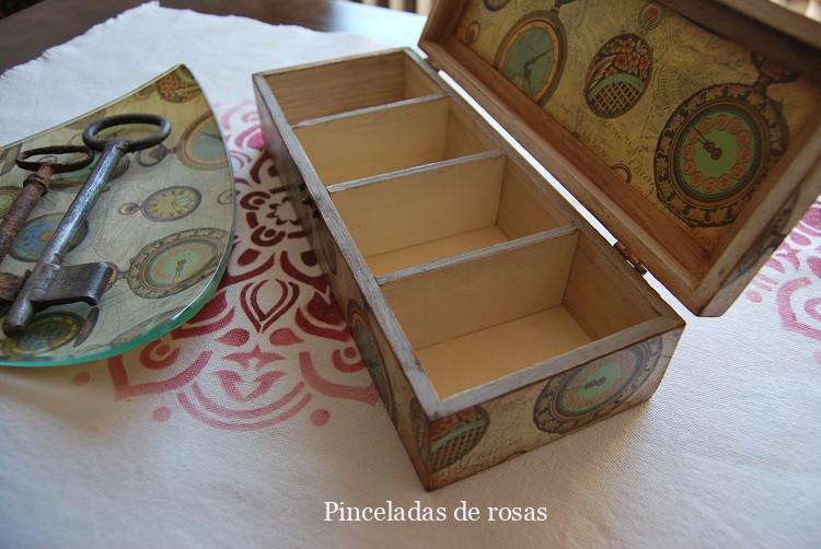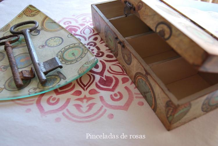 La caja la he pintado con pinturas acrílicas, un papel de decoupage protegida con barniz y finalizada con pátinas