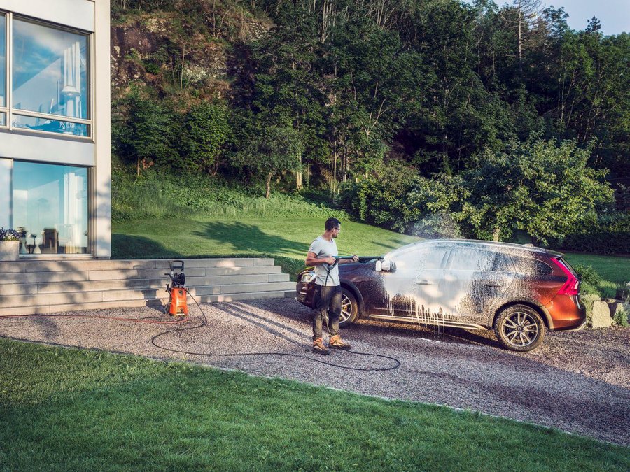 Vamos a empezar limpiando lo que generalmente está más sucio: las ruedas. Lo primero que tenemos que hacer es aplicar el producto limpia llantas y dejarlo actuar durante unos segundos. Después, con ayuda del cepillo (es muchísimo más cómodo si tiene mango), frotamos las llantas enérgicamente ya que suelen tener bastante suciedad acumulada. Para terminar, aclaramos con agua hasta que queden brillantes.Continuamos con el resto del coche, limpiándolo de arriba abajo. Para ello, lo enjabonamos con agua y jabón especial (si no tenemos, podemos utilizar cualquier jabón neutro o champú para niños, porque no dejan residuos ni marcas de agua). Nuestra mejor aliada para llevar a cabo esta tarea es una hidrolimpiadora, como la PW 345C de Husqvarna, ya que está diseñada precisamente para este fin, para realizar trabajos de limpieza en jardines y vehículos.