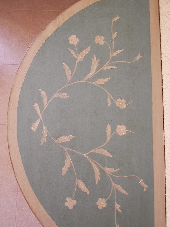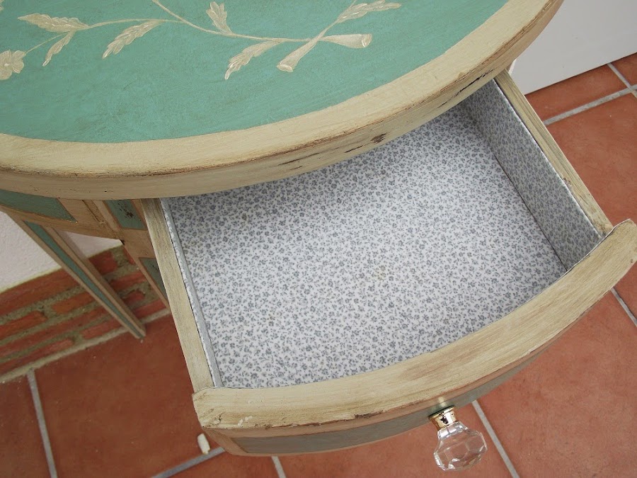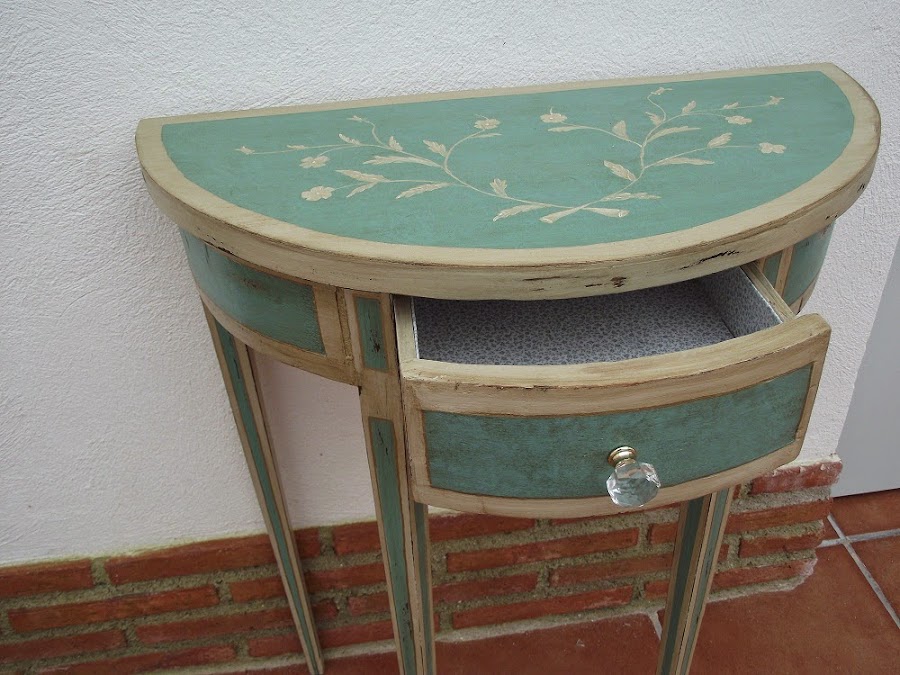 Para pintar el mueble elegí un verde de la gama de los que se han dado en llamar colores gustavianos, colores suaves y luminosos quizás un poco más subido de tono, porque en el sitio que la iba a colocar era mejor un color que destacase sobre la pared pintada de amarillo.