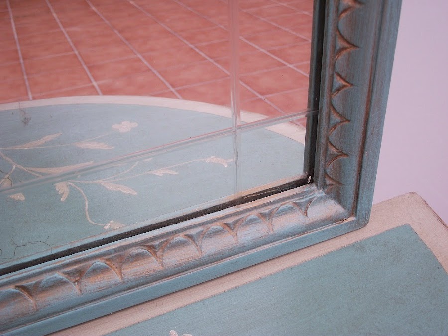 Para coordinar con el dorado de la consola apliqué cera dorada con el dedo, dando suaves toques en las partes sobresalientes de la moldura. Para finalizar, igual que a la consola, pátina marrón retirando el exceso con un paño de algodón, y cera incolora para dar brillo.