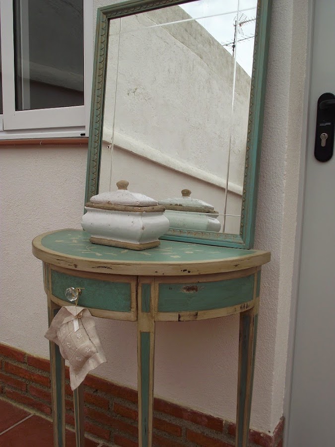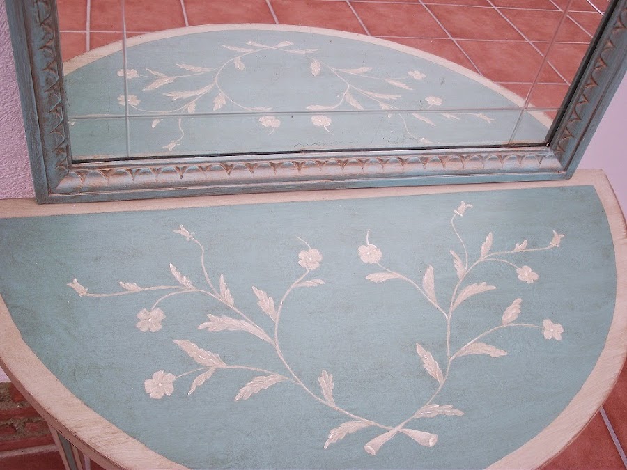 El resultado final me encanta, ha quedado con un estilo clásico y un puntito romántico por las flores y el dorado de las líneas que le da una personalidad que antes no tenía. Y en el espacio que ocupa luce muy bien, por las mañanas da el sol en ese pasillo y se ve preciosa.
