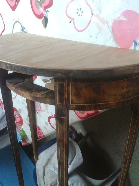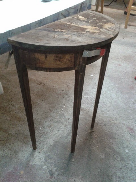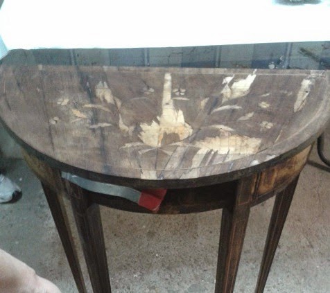 Esta consola la encontré en el mercado semanal de Estremoz (os hablé de él en estepost) y me costó 12 euros. Claro, que en el estado que estaba podía incluso parecer un precio excesivo: las patas desencoladas, la taracea dañada, faltas de madera por doquier?