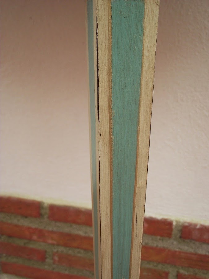 Para terminar pinté las mismas líneas que tenía dibujadas anteriormente pero en esta ocasión con pintura oro antiguo. El proceso fue fácil aunque muy laborioso: cinta de carrocero en ambas partes de cada una de las líneas a pintar, pintar la línea dos o tres veces, hasta que se viera uniforme, levantar la cinta y volver a empezar con la siguiente línea. Así en cuatro patas, con cuatro caras cada pata y con dos líneas cada cara de cada pata. Total: ¡¡ 64 líneas de cinta de carrocero!!.