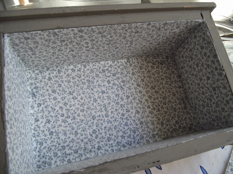 El cajón tenía un pomo feo y grande que decidí sustituir. Además entelé el cajoncito con una tela que ya he usado varias veces (este piqué gris da de sí como el chicle y no me cansa porque es muy discreto).