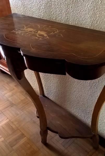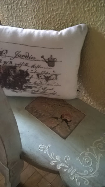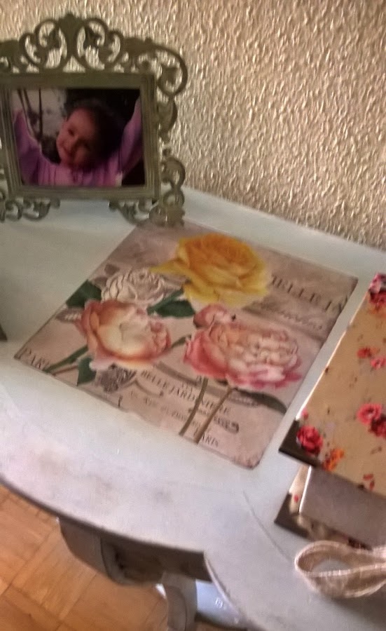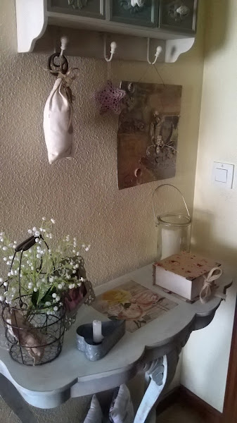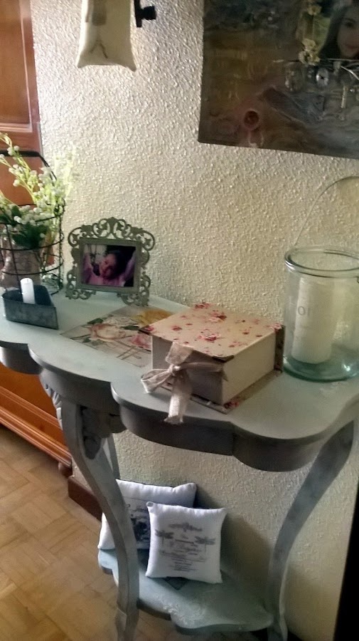 Y esta mañana tocaba pintura. Así ha quedado la consola que "recogí" el otro día: Pintada en chalk paint verde agua, desgastado en blanco, con ligeros toques en marrón chocolate y découpage (alguna flor tenía que aparecer por aquï).