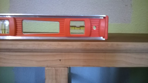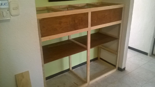 4. Ahora colocaremos los horizontales, igualmente midiendo uno por uno. Los colocaremos a la altura de donde vamos a colocar los rieles de los cajones asegurándonos que queden bien nivelados y fijos a los verticales ya que sostendrán el peso de los cajones y su contenido. Igualmente colocaremos los horizontales donde queremos que queden las repisas dentro de las puertas. Nosotros decidimos colocar dos de cada lado. Hubo que verificar la estructura, así que me atreví a subirme para probar con mi propio peso... afortunadamente resistió...