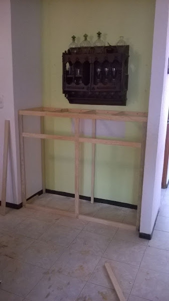 2. Primero colocamos el bastidor horizontal superior para establecer la altura y el ancho y alto del mueble, a partir de ahí nos vamos hacia abajo e ir progresando pieza por pieza. El bastidor debe quedar tan cuadrado y nivelado como la misma construcción lo permita, especialmente nivelado, ya que el resto de la construcción dependerá mucho de esta pieza