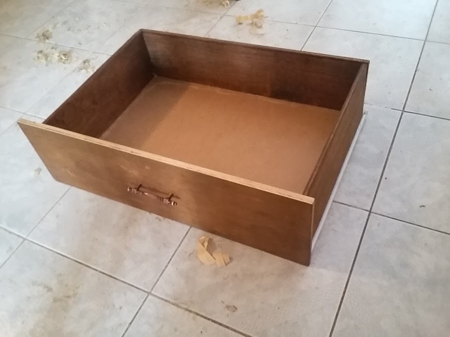 5. Por aparte, debemos hacer los cajones, éstos son de aprox. 20 cm de alto x 60 cm de largo y 4o cm de fondo. Son una construcción sencilla de 4 lados con un fondo de MDF de 6 mm, reforzado con clavos y pegamento para evitar que se desfonde en el futuro.