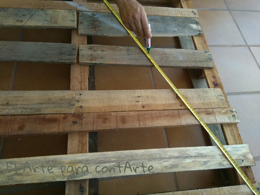 Bueno, en primer lugar lo que hacemos es marcar la silueta del árbol (o sea, un triángulo). Como el palet es cuadrado es cuestión de marcar el centro de la parte superior y trazar dos lineas rectas hacia los extremos inferiores (una linea hacia el vértice izquierdo y otra hacia el vértice derecho).