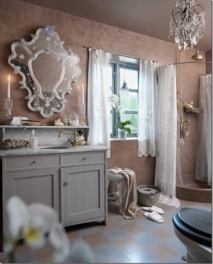 Aunque si no queremos una bañera también se puede optar por una plato de ducha protegido por una carpa romántica con encaje exterior y la parte interior de plástico para que se pueda mojar y sea impermeable pero que logre darle el más puro realismo desde fuera. Puede situarse en un rincón del baño como en la foto.