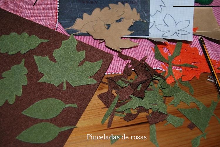 Y las hojas con tela de fieltro a las cuales les he pintado los nervios con un lapice de color amarillo, también se puede hacer con cartulinas en los colores se desee