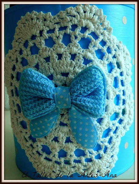 Para finalizar me pidieron un bote para colocar los cepillos y peines también en tonos azules. Tras pintarlo de azul le hice unos lunares en blanco y le pegué un tapetito de crochet blanco y en el centro un lazo azul también con lunares blancos. Quedó muy mono.