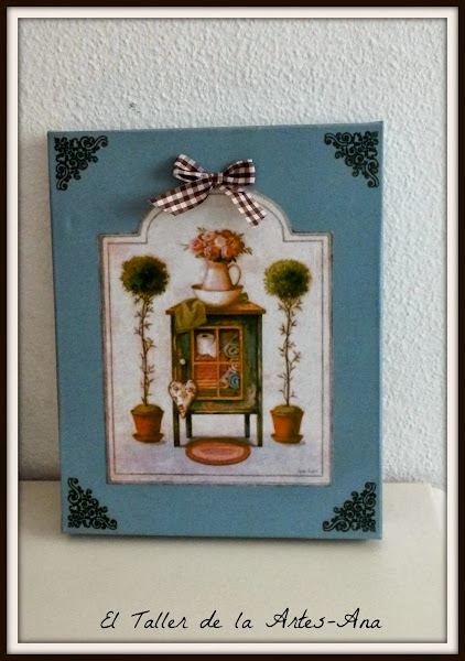 Ahora vamos con un lienzo en tonos azules. La imagen es decoupage y las esquinas van transferidas. Como adorno final un lacito de cuadros vichy en marrón. Que mono, verdad?