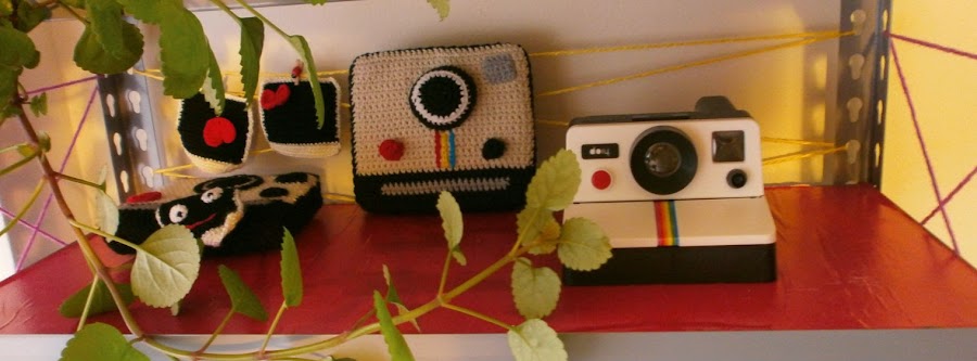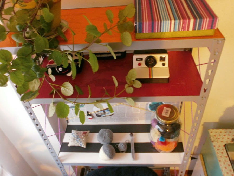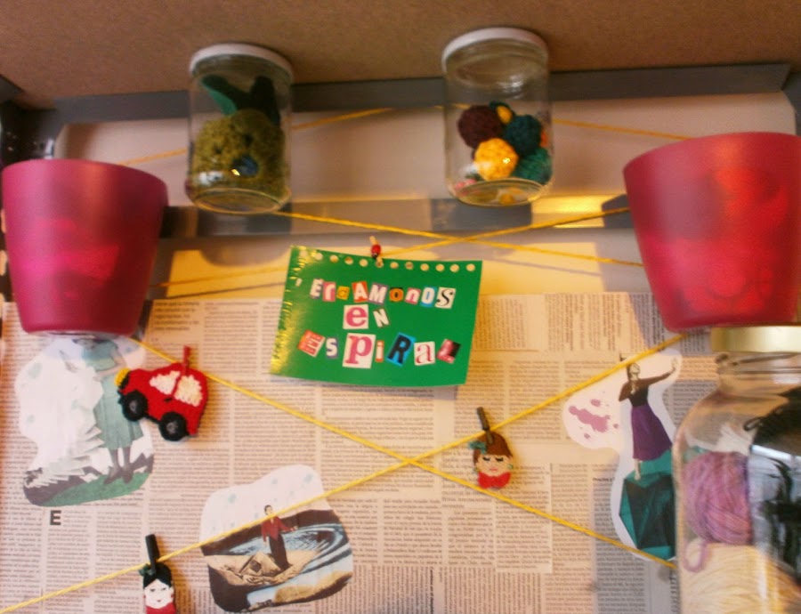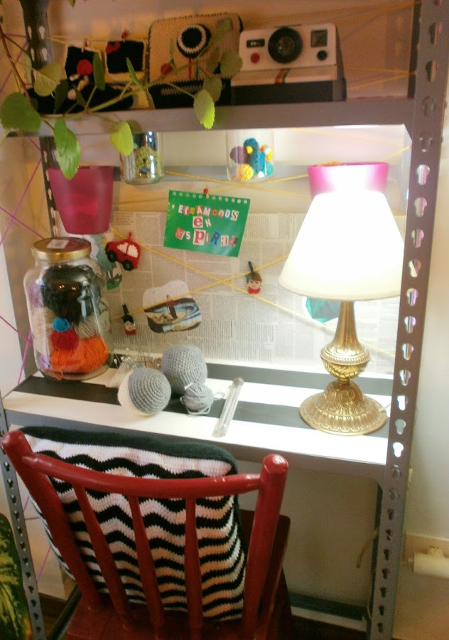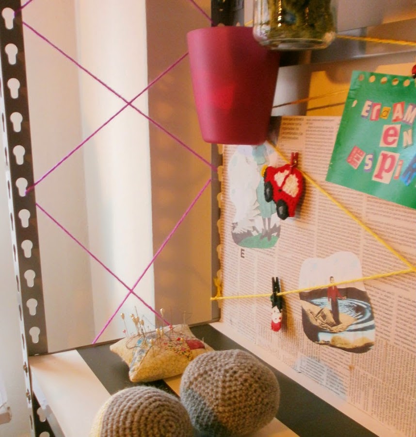 Y, por último, "tejimos" la estructura con lana, para aprovechar y colgar nuestras cosas... ¡Ah! Sobraba una barra, así que la colocamos para colgar unos botes de plástico con asa.