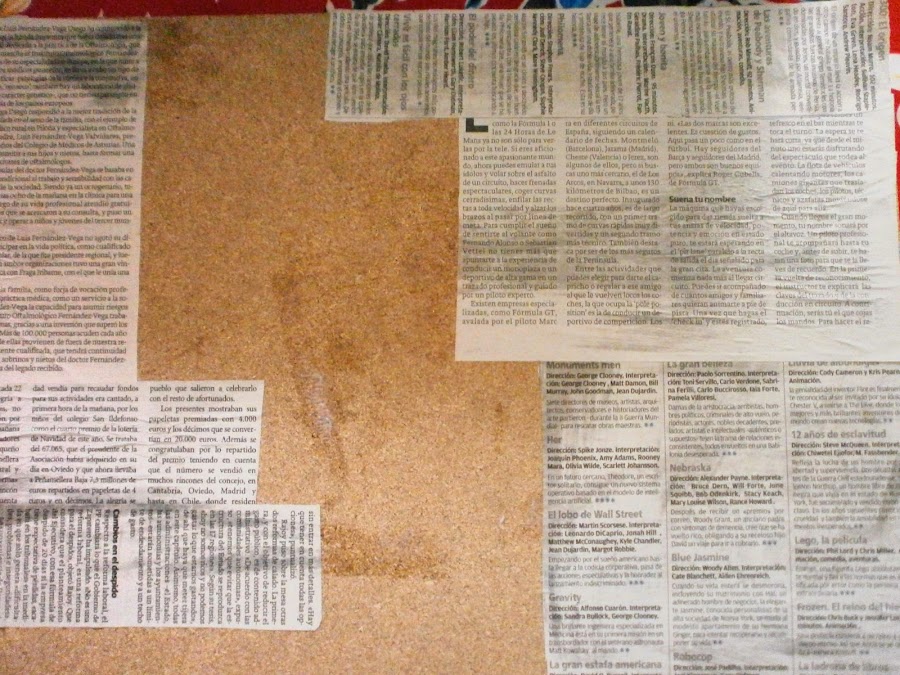 Forramos las baldas, cada una con un motivo distinto: papel de periódico, papel de empapelar y papel de colores: