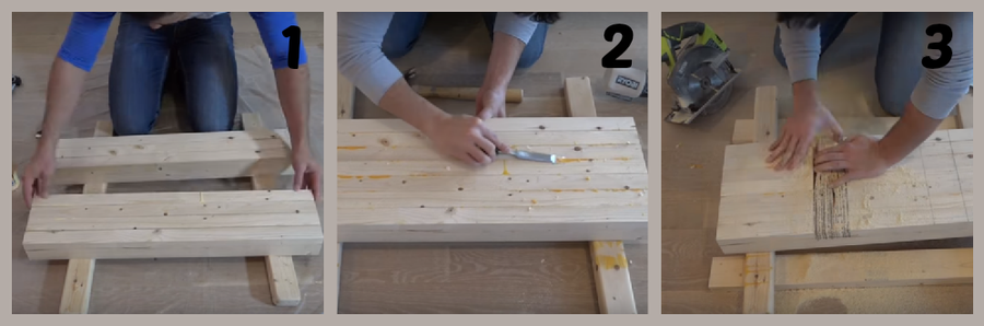 1. Cogemos 6 o 7 tiras de madera 2x4 y las vamos pegando unos al lado de los otros, las colocamos en dos del mismo tamaño pero en distinto sentido y lo dejamos secar 48 horas mientras están bien apretados y juntos. Después, hacemos lo mismo con otra tanda de tablones.