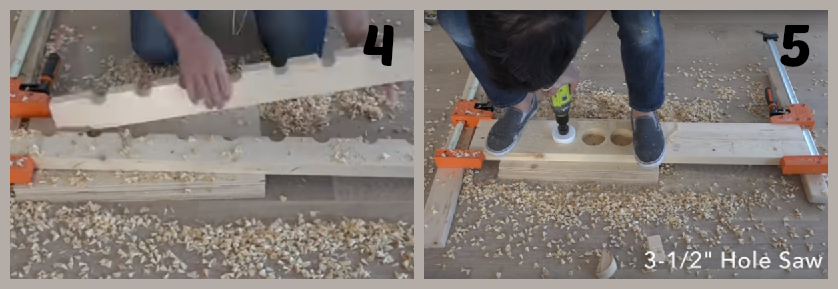4. A continuación cogemos tablas más largas y anchas de 2x4, juntamos 2 y marcamos dónde irán los agujeros más pequeños, el lugar donde se colocarán los morros de las botellas.