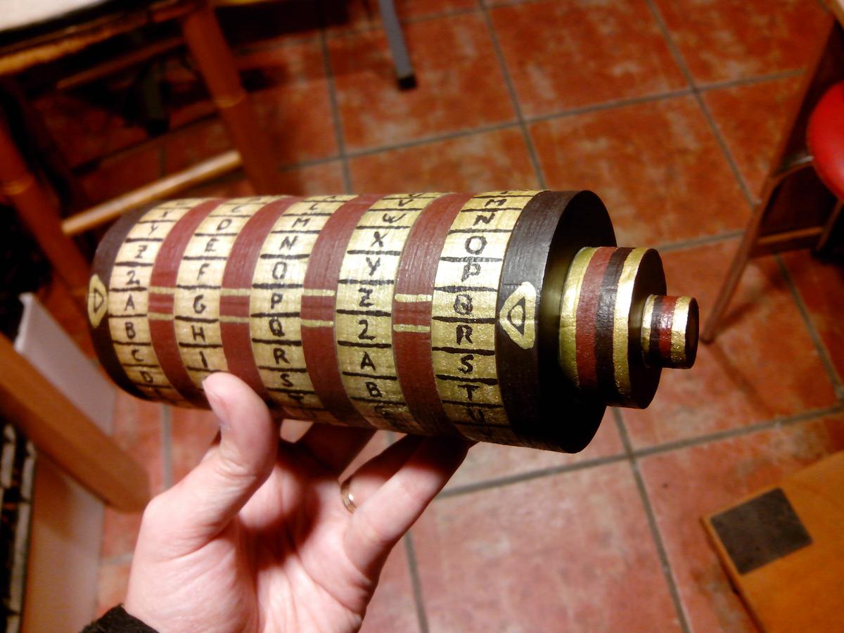 Como bien dice el titulo, se trata de un criptex (para el que no sepa en que consiste, aquí una pequeña explicación). Por definición, un criptex se compone de una serie de cilindros con aberturas y pestañas, y unos discos que girándolos en una combinación determinada, permites abrir los cilindros y descubrir el objeto escondido en su interior.