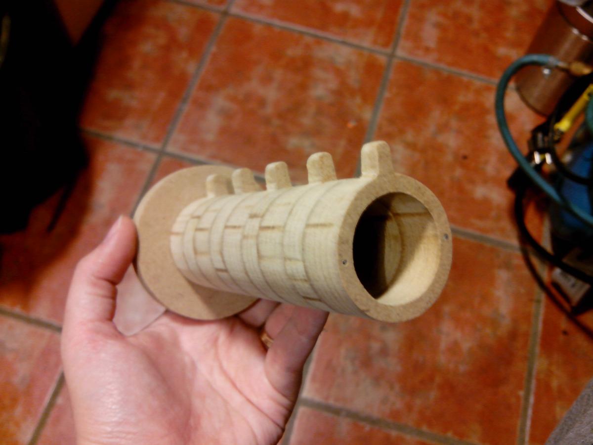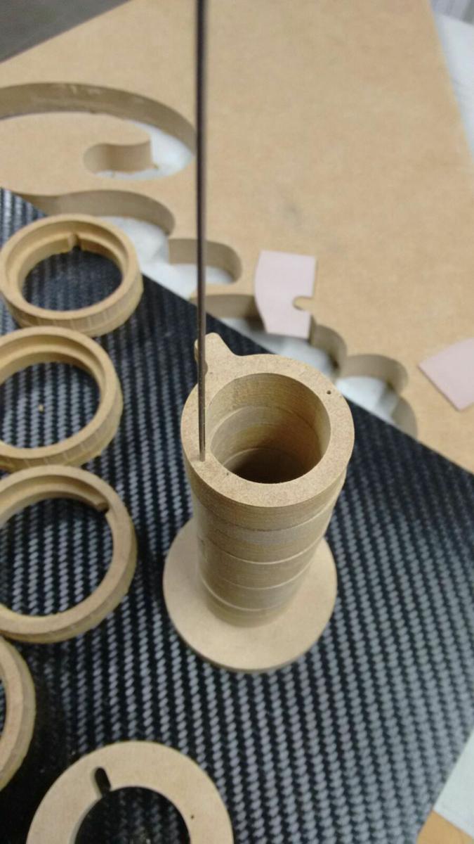 Aquí tenéis los cilindros una vez mecanizados. Una cuestión bastante importante, es tener en cuenta la tolerancia que hay que darle a los diámetros interiores y exteriores, para que todo encaje fácilmente. Si no, tendremos mucho trabajo de lija. El MDF ademas no es muy bueno para dejar tolerancias del orden de las décimas de milímetro, por lo que lo mejor es jugar con margenes generosos. Yo he dejado 1 mm de margen entre diámetros de piezas que tienen que deslizar una dentro de la otra.
